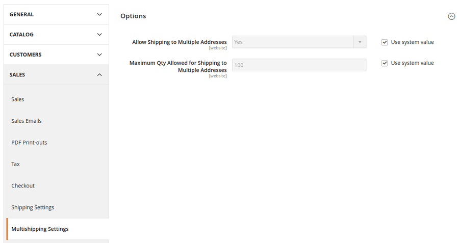 - Unter Stores > Settings > Configuration muss im Menü auf der linken Seite der Abschnitt Sales aufgeklappt, darin der Punkt Multishipping Settings gewählt und dann der Bereich Options durch einen Klick sichtbar gemacht werden.