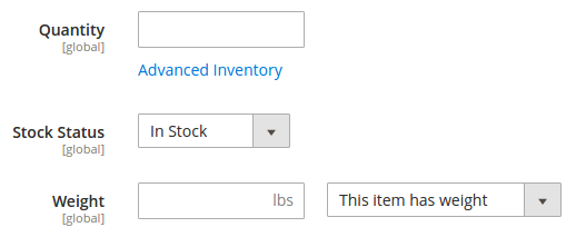Eine Reihe weiterer Eingabefelder dient der Lagerverwaltung des Produkts. Hier können neben der verfügbaren Stückzahl (Quantity) auch der Lagerstatus (Stock Status: „Auf Lager“ bzw. „In Stock“ oder „Nicht auf Lager“ bzw. „Out of Stock“) definiert werden. Für virtuelle Produkte ist voreingestellt, dass sie kein Gewicht (Weight) haben. Bei einem Klick auf den Link Advanced Inventory kann eine zusätzliche Eingabemaske für die erweiterte Lagerverwaltung geöffnet werden. Auch darauf wird an dieser Stelle aber aus besagten Gründen ebenso wenig eingegangen, wie auf die Besonderheiten für die Lagerverwaltung für einen Onlineshop mit mehreren Lagerstandorten (Multi Source Inventory).