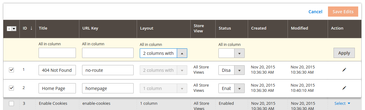 Einige grundlegende Felder mit Seiteninformationen lassen sich direkt in der Tabelle bearbeiten: Title, URL Key, Layout und Status. Wenn eine einzige Seite verändert werden soll, können die gewünschten Werte nach dem Auswählen der Seite über die Checkbox und der Aktion Edit direkt in der Tabelle bearbeitet und anschließend über den Button Save gespeichert werden:
