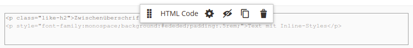 Um benutzerdefiniertes HTML, CSS oder JavaScript in eine Seite einzufügen, muss links unter Elements das Werkzeug HTML-Code gewählt und per Drag-and-drop an die gewünschte Stelle gezogen werden. Beim Mouse-over über das HTML-Code-Element erscheint ein grafisches Kontextmenü. Darin sind eine Reihe von Funktionen zum Bearbeiten des Elements enthalten.