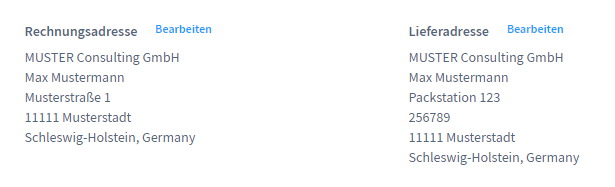 - Hinter den Links zum Bearbeiten der Adressen verbirgt sich eine Maske zur Änderung oder Ergänzung der Kundenadresse. Dies kann — je nach Status der Bestellung — noch in die weitere Bearbeitung und Lieferung einfließen.